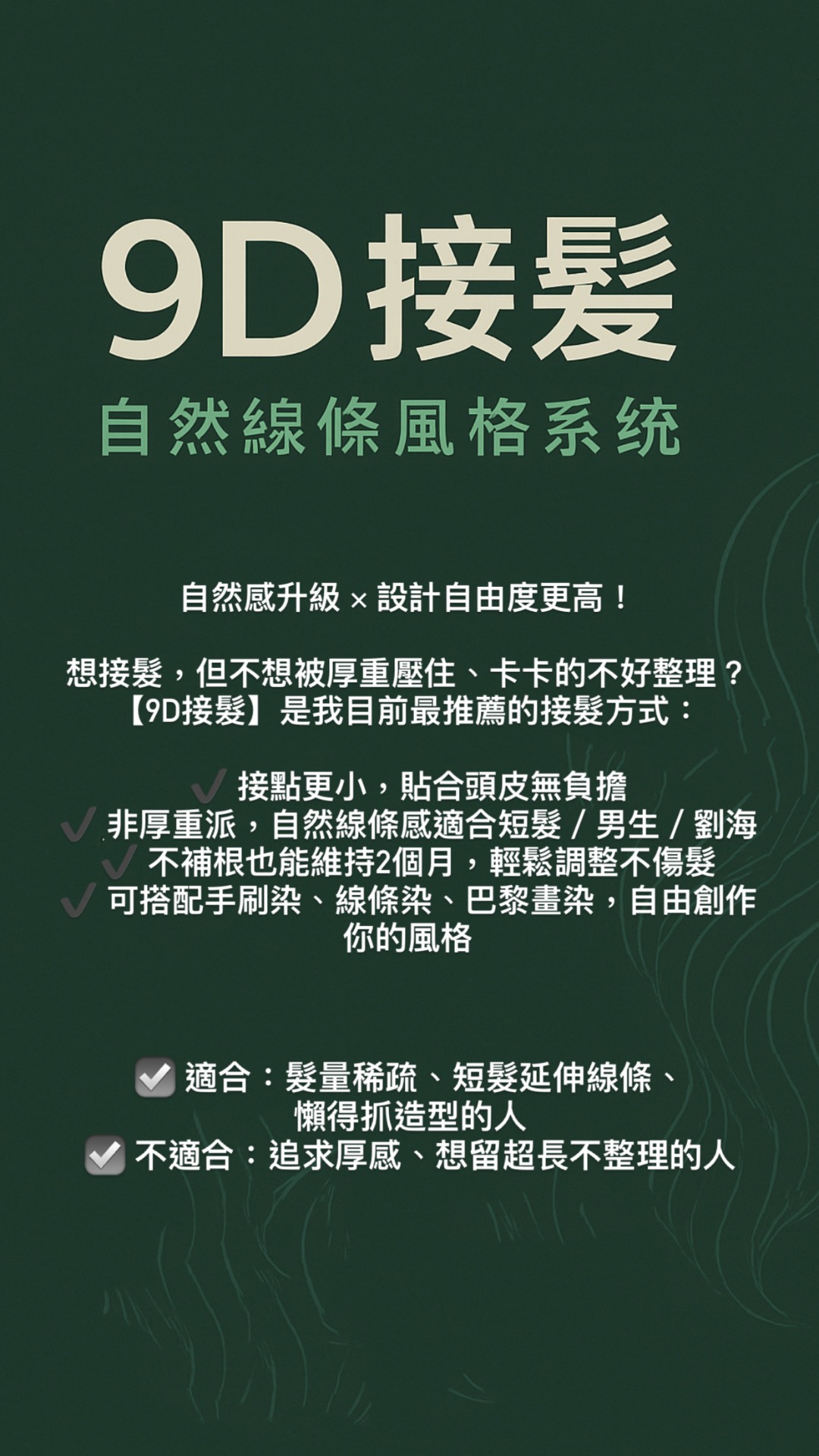 9D接髮 需要先預約來店諮詢溝通 並付訂金 接髮金額一半以上 才會跟廠商叫貨 (約一星期)可以接受的點下面連結預約諮詢。